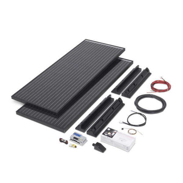 Lieferumfang: Inklusive Monokristalline(s) Solarmodul(e), Solarregler PowerPlus mit Temperaturfühler, Dach-Spoilerset inkl. Zubehör,, Dachdurchführung, Service-/Verteilerblock, Klebeset für Spoilerset und Dachdurchführung, Kabelsatz innen/ außen, Kabelsatz für Fahrzeuge mit EBL-Basisstation (Fahrzeuge der Hymer-Gruppe), Kleinteile, Montageanleitung