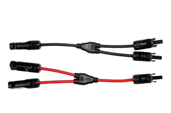 Waterproof MC4-compatible connectors for tool-free assembly and disassembly, each with two connections for plus and minus, enabling reverse polarity protected parallel connection. Fits and the connections of the SPL25 and SPL105 solar modules (Movera item no. 9962242 and 9962243). Plastic-coated.