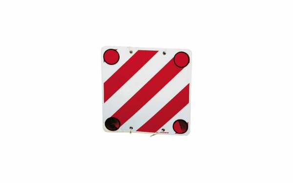 Rot-weiß reflektierende, diagonal gestreifte Warntafel, mit 4 Katzenaugen zur Kenntlichmachung von Sonderlasten, z. B. Fahrradträger.
