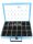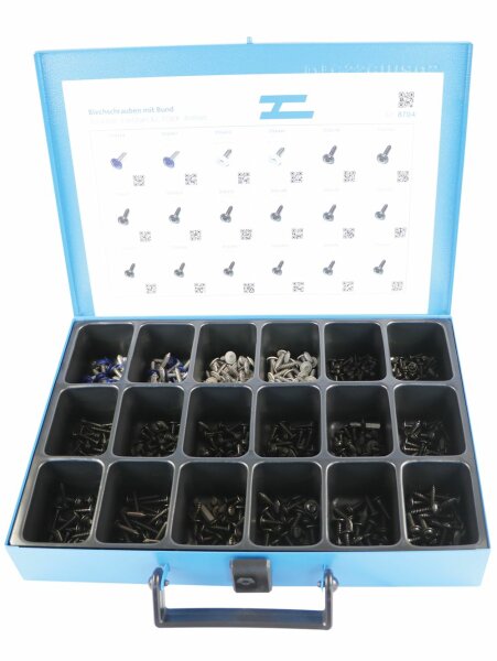 Sortiment Blechschrauben mit Bund, TORX-Antrieb, Edelstahl A2 (rostfrei) - Linsenkopf-ø 11.5mm in blau, weiss oder schwarz lackiert, im Metallkoffer mit 18 Fächern, Inhalt: 700 assortierte Schrauben 3.5x9.5 bis 4.8x25mm inkl. 3 Bits T10/T20/T25 TORX - blau, weiss, schwarz - 3.5x9.5 - 4.8x25