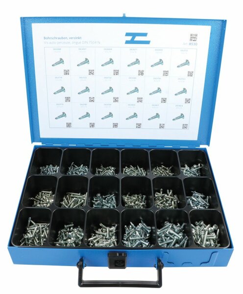 Sortiment Bohrschraube mit Linsenkopf M-H (mit Kreuzschlitz) im Metallkoffer mit 18 Fächern. Inhalt: 900 assortierte Schrauben in den Grössen 3.5x9.5 - 4.8x25 verzinkt verzinkt - DIN 7504N - 3.5x9.5 - 4.8x25