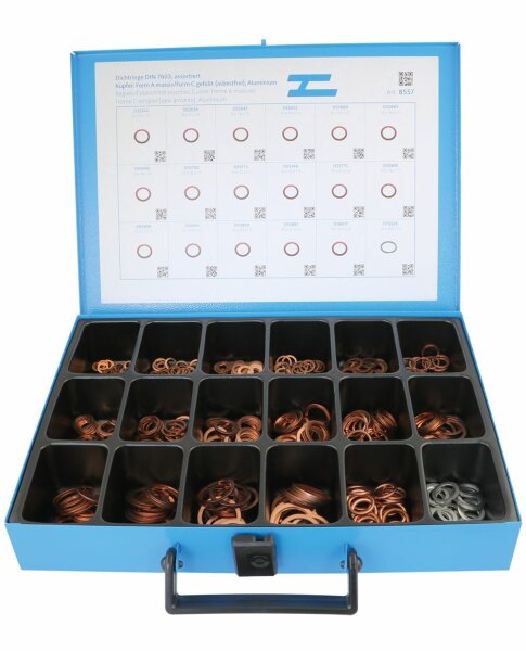 Sortiment Dichtringe gemischt im Metallkoffer mit 18 Fächern. Inhalt: assortierte Dichtringe (Kupfer massiv/gefüllt und Alu-Ringe) DIN 7603 Form A (massiv): 6x10x1.0mm - 26x32x2.0mm Form C (gefüllt): (asbestfrei): 14x20x2.0mm Aluminium (massiv): 14x20x1.2mm DIN 7603 Form A & C (asbestfrei), Aluminium