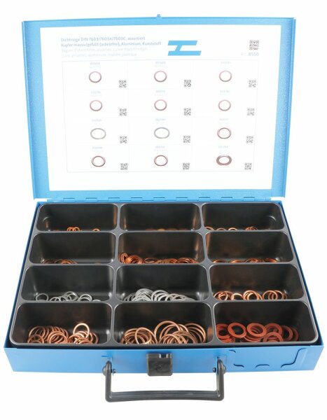 Sortiment Dichtringe universal im Metallkoffer mit 12 Fächern. Inhalt: 300 assortierte Dichtringe (Kupfer massiv/gefüllt, Aluminium, Kunststoff) in den Grössen 6x10-26x32mm & 12x16-22x27mm & 14x22mm 300 Teile, DIN 7603 und andere