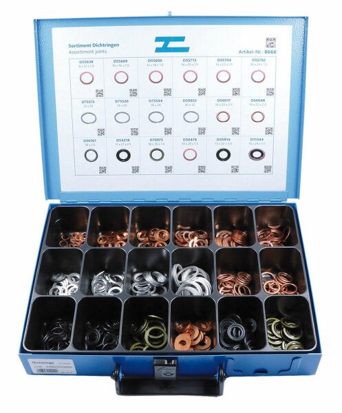 Sortiment Dichtringe gemischt im Metallkoffer mit 18 Fächern. Inhalt: 395 assortierte Dichtringe (Perbunan, Kupfer (massiv/gefüllt)- und Alu-Ringe) gem. Sortiment Perbunan-, Kupfer-, Alu-Ringe