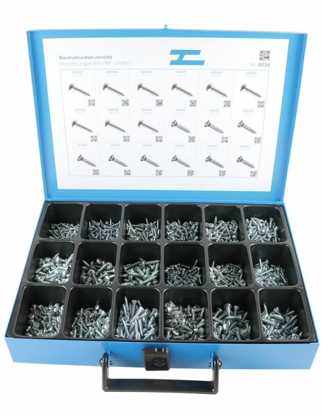 Sortiment Linsen-Blechschraube & Linsensenk-Blechschrauben mit Kreuzschlitz im Metallkoffer mit 18 Fächern, Inhalt: 1’600 assortierte Blechschrauben DIN7981C + DIN7983C in den Grössen: 3.5 x 9.5 - 4.8 x 22 (C= mit Spitze, H=mit Philips Kreuzschlitz), galvanisch verzinkt verzinkt - DIN 7981/7983 - 3.5 x 9.5 - 4.8 x 22