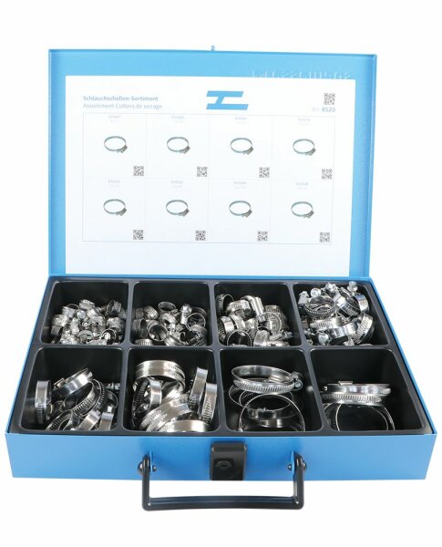 Sortiment Schlauchbriden NORMA im Metallkoffer mit 8 Fächern. Inhalt: 150 assortierte Schlauchschellen in den 8-12 bis 32-50mm Band und Gehäuse aus Edelstahl mit verzinkter 6-kt Wurmschraube, geschlitzt, Antrieb asymetrisch Breiten 7.5/9mm Edelstahl A2 - 150 Stk - 8/12 bis 32/50mm