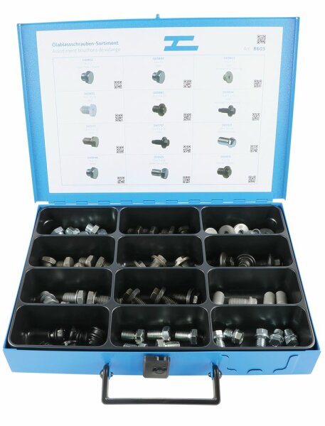 Sortiment Oelablassschrauben im Metallkoffer mit 12 Fächern. Inhalt: 60 Stk Oelablassschrauben mit/ohne Dichtringen für Opel, VAG, Mazda, Ford, Mercedes/Daimler/Chrysler, BMX, etc. Sortiment 12fach