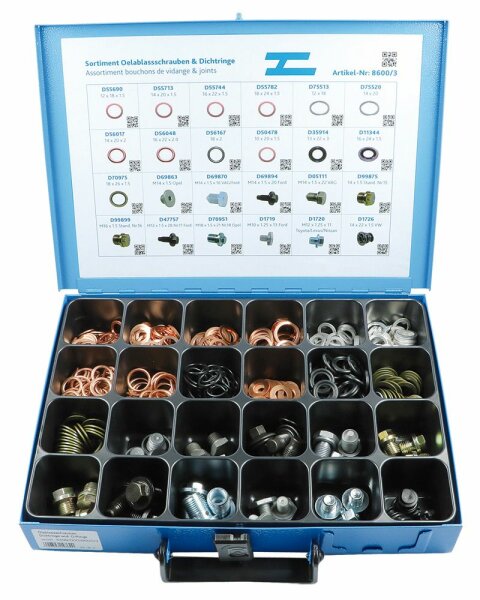 Sortiment Oelablassschrauben & Dichtringe im Metallkoffer mit 24 Fächern. Inhalt: • 175 Dichtringe Kupfer massiv DIN 7603 A • 75 Dichtringe Kupfer asbest-frei DIN 7603 C • 100 Dichtringe Aluminium • 50 O-Ringe Perbunan, ölfest • 50 Dichtringe mit Gummilippe innen • 50 Dichtringe Stahl, Innen mit Gummilippe • 33 Ölablassschrauben, sortiert Sortiment 24-fach