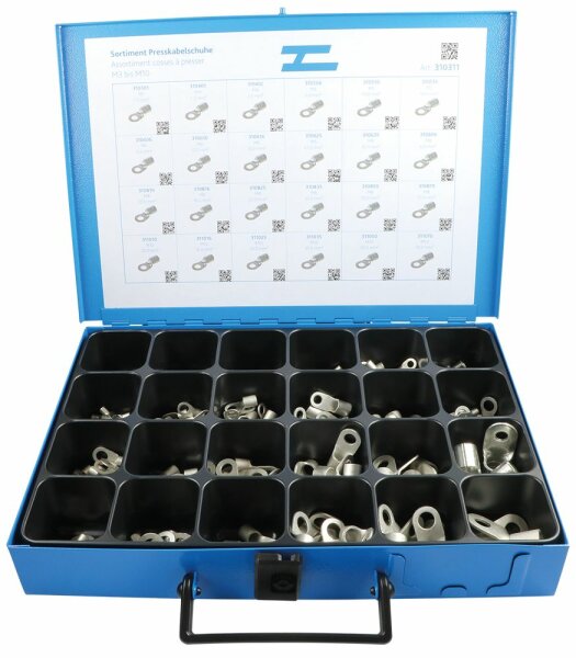 Sortiment Quetschkabelschuhe im Metallkoffer mit 24 Fächern. Inhalt: 283 assortierte Quetschkabelschuhe von M3 - M10 283 Quetschkabelschuhe