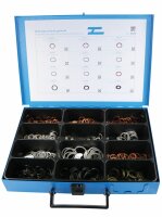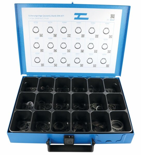 Sortiment Sicherungsringe für Wellen (aussen) DIN 471 im Metallkoffer mit 18 Fächern. Inhalt: 180 assortierte Seeger-Ringe in den Grössen ø8x0.8 - ø34x1.5mm schwarz (blank) DIN 471 - 180 Stk - ø8x0.8 - ø34x1.5mm