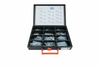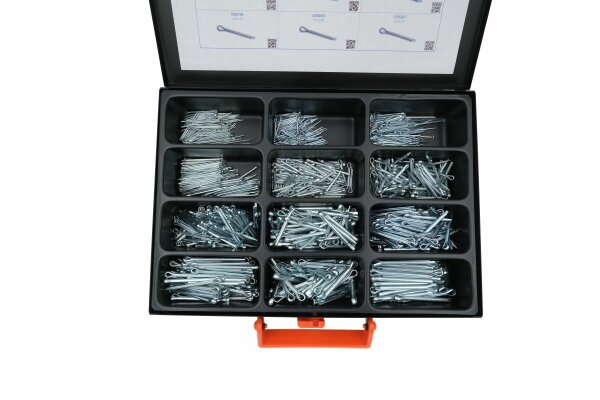 Sortiment Stahl-Splinten im Metallkoffer mit 12 Fächern. Inhalt: 1’100 assortierte Splinten in den Grössen 1.6x32 - 5x50 galvanisch verzinkt verzinkt - DIN 94/ISO 1234 - 1.6x32 - 5x50mm