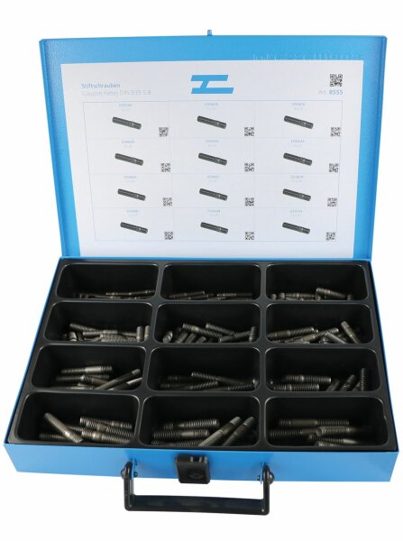 Sortiment Stiftschrauben/Stehbolzen im Metallkoffer mit 12 Fächern, Inhalt: 195 assortierte Schrauben DIN 939 in den Grössen: M6x20 - M10x50 geschwärzt (blank) geschwärzt - DIN 939 - M6x20 - M10x50