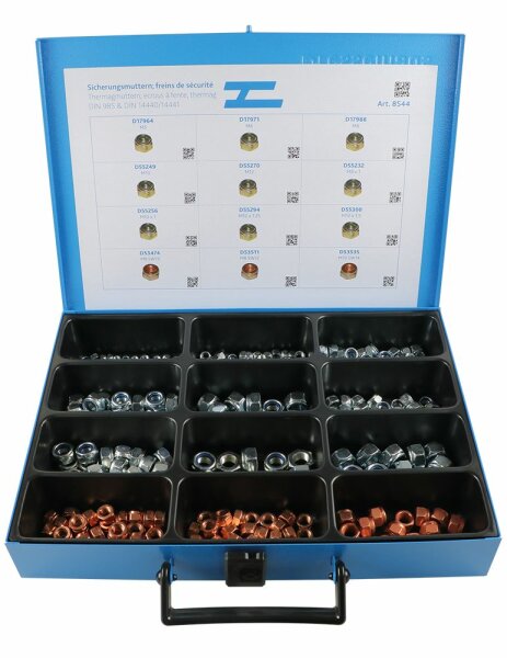 Sortiment Stopp- & Schlitzmuttern im Metallkoffer mit 12 Fächern Inhalt: 325 assortierte Muttern DIN 985/14440 in den Grössen: M5-M12 & M8-M10 galvanisch verzinkt, verkupfert verzinkt, verkupfert - DIN985/14440 - M5-M12