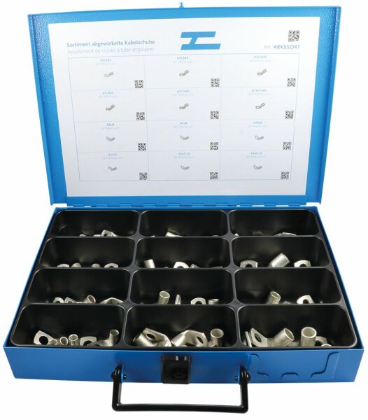 Sortiment abgewinkelte Rohrkabelschuhe im Metallkoffer mit 12 Fächern. Inhalt: 60 Stück assortierte abgewinkelte Rohrkabelschuhe (45°/90°) 45°: M6/25mm2 - M10/70mm2 90°: M8/25mm2 - M10/70mm2 60 Stück abgewinkelte Rohrkabelschuhe