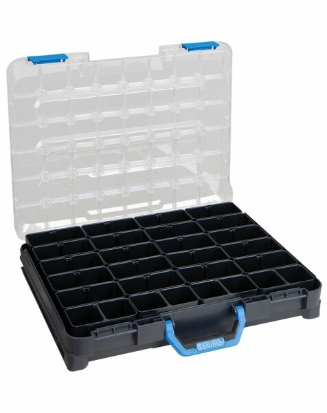 Kunststoff-Sortimentskoffer mit transparentem Deckel aus dem Sortimo T-Boxx System; standardmässig bestückt mit 24 grauen Insetboxen (grau=104x52x63mm); die Einteilung sind beliebig veränderbar und mit anderen Insetboxen kombinierbar; Praktisch: durch herausnehmen einzelner Insetboxen können auch grössere Gegenstände verwahrt werden während die restlichen Boxen bei geschlossenem Deckel dennoch fixiert sind. 440x350x80mm, Kunststoff, 24 Fächer