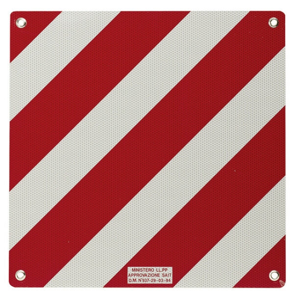 Reflective aluminium sign in red/white for overhanging loads, with 4 holes and eyelets. Rounded corners, diam. 2 cm.