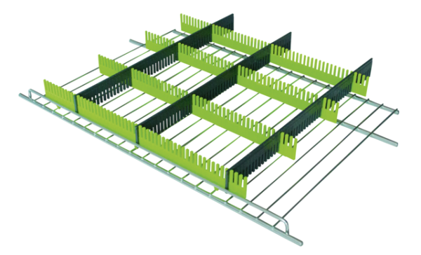 Das Stecksystem besteht aus 8 Stauleisten, die einen variablen Facheinsatz ergeben. Die Längs- und Breitstege aus flexiblem Kunststoff bieten optimalen Trennschutz für verschiedene Artikel und stabilisieren dadurch ihre Gegenstände bruchsicher und rutschfest. An der oberen Längsseite einer Stauleiste befinden sich viele Zinken, die durch einfaches Zusammenstecken eine stabile und feste Verbindung ergeben. Die enge Rasterung der Zinken ermöglicht eine flexible Verstellbarkeit auf fast jeden Abstand.