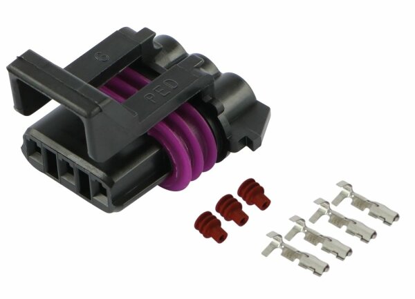 Stecker-Set Delphi Metri-Pack 150, 3polig, männlich, 1.5mm2, bestehend aus: 1x Steckergehäuse (schwarz) mit Dichtung 4x Kontakthülsen (w) 1.5mm2 3x Gummidichtungen (rot) mit Kabelschuhen & Dichtungen