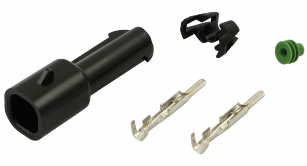 Stecker-Set Delphi Metri-Pack 280, 1-pol, weiblich, 1.5 mm2 mit Zugentlastung, bestehend aus: 1 x Steckergehäuse (schwarz) 2 x Flachstecker (m) 1.5 mm2 1 x Gummidichtung (grün) 1 x TPA/Secondary Lock (schwarz) mit Kabelschuhen, Dichtungen & TPA Lock