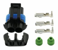 Stecker-Set Delphi Metri-Pack 280, 2polig, männlich, mit Secondary Lock, 1.5mm2, bestehend aus: 1x Steckergehäuse (schwarz) mit Dichtung 3x Kontakthülsen (w) 1.5mm2 2x Gummidichtungen (grün) 1x TPA/Secondary Lock (schwarz) mit Kabelschuhen, Dichtungen & TPA Lock
