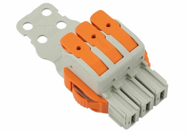 - 3er-Leiterklemme mit Betätigungshebeln WAGO CAGE CLAMP® - versilberte Kontakte - Klemmfederwerkstoff Chromnickelfederstahl - mit Befestigungsmöglichkeit/Kabelzugentlastung - für Kabel mit oder ohne Aderendhülsen - Temperaturbereich von -60° C bis +120° C - Litzenkabel bis 25 mm2 - mit Aderendhülsen bis 16 mm2 43.8 x 29.1 x 94.8 mm