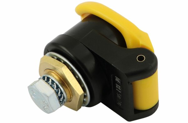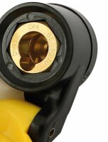 Prise intégrée pour tous les types de câbles de soudage Connexion sûre et rapide avec fermeture à baïonnette. Pièce conductrice de courant en alliage de cuivre spécial, entièrement isolée. Connexion : M10 x vis Trou d'installation : 20 mm Couvercle : 45 x 63 mm 50 - 70 mm2, connexion M10, jaune / vert
