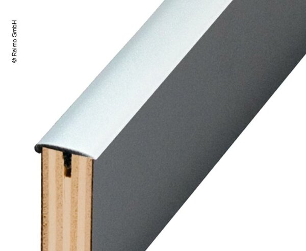 T-Umleimer one-sided with nose 15 mm to cover the cut edges of furniture boards for plate thickness 15 mm.Assembly: tap the bar of the Umleimers e.g. with a rubber mallet (to avoid impact pressure points) in the groove. It can be additionally fixed with hot glue: to do this, fill hot glue into the groove beforehand.