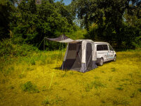 No poles, small pack size, light weight and easy setup make the "UPDATE VITO PREMIUM" the perfect rear tent. The new features such as mosquito netting in all zipper doors, skirt to the bumper and sewn-in floor pan provide additional comfort. The front door has an additional mosquito net window and can also be set up as a sun awning. The two side entrances have tinted windows with cover. The best seller with protection from mosquitoes and insects has an additional ventilation above the entrance and can be attached to the side of the vehicle with clips. The sewn-in floor pan can be attached to the bumper with Velcro. The window in the roof can still be used as a skylight.The large interior is suitable for a camp bed, bicycles, as a dog run, etc. and can also be used as a changing room or shower tent. The rear tent is simply pulled over the open tailgate and then attached to the vehicle and ground.Product Data:Color: Gray / Light Gray / LimeMaterial: 100% 190T ripstop polyesterUV coatedFlame retardant