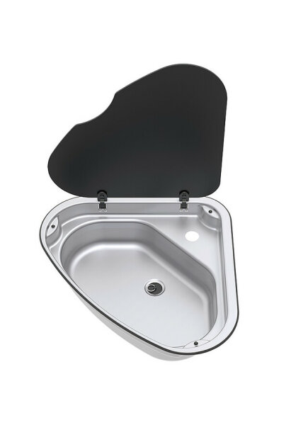 The Basic Line 33 is a top-quality triangular stainless steel sink with a glass lid and a tap hole.