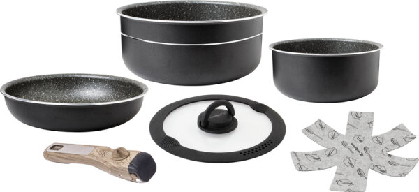 Weitere Spezifikationen:Maße Topf A: Ø 18 cm / H 9 cm - 2,3 lMaße Topf B: Ø 22 cm / H 10 cm - 3,8 lMaße Pfanne: Ø 22 cm / H 5 cm - 1,9 lMaße Deckel: Ø 22 cm