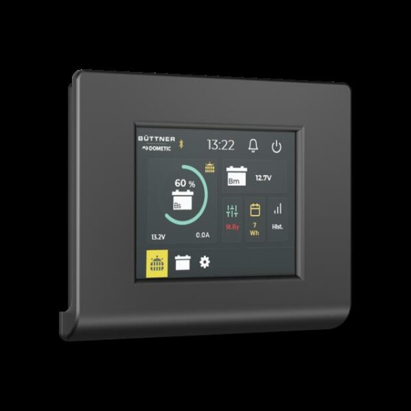 Ein Display zur Überwachung des neuen Solarreglers und der neuen Büttner Dometic Lithium Batterie Tempra. Es ist nun möglich, alle Daten von der neuen Solaranlage und der neuen Tempra Batterie von einer einzigen Schnittstelle zu überwachen und zu steuern. Dies kann auch per Bluetooth für IOS- und Android-Smartphones mit der neuen Büttner Dometic App auf Ihrem mobilen Endgerät dargestellt werden.