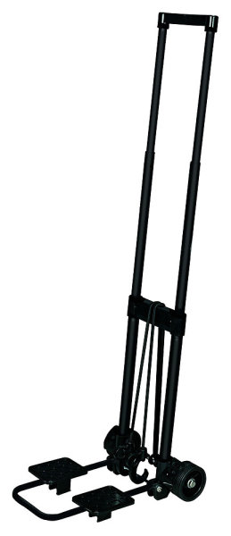 Transportwagen mit teleskopierbarem, einklappbarem Alu-Gestell, robustem KS-Verbindungsteilen und breiten Rädern.