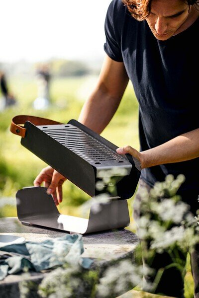 Der stylisch tragbare Holzkohlegrill für unterwegs. Die Abdeckung dient gleichzeitig als sichere Basis für den Grill. Zwei Höhen über der Holzkohle und Vertiefung für Handelsübliche Spieße sorgen für ultimativen Benutzerkomfort. Die Edelstahlteile sind Spülmaschinen geeignet.