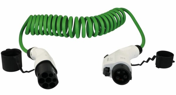 Mode 3 Spiral-Übergangs-Ladekabel für Elektro-Fahrzeuge mit Typ 1 Steckdose. Sehr robustes, flammwidriges PUR Spiral-Kabel mit Typ 2-Stecker und Typ 1-Kupplung (Stecker und Kupplung geschraubt). Die Ladung erfolgt 1-phasig (230 V). Kabelquerschnitt 2.5 mm2. für Mode 3 Ladestationen Typ 2 --> Typ 1