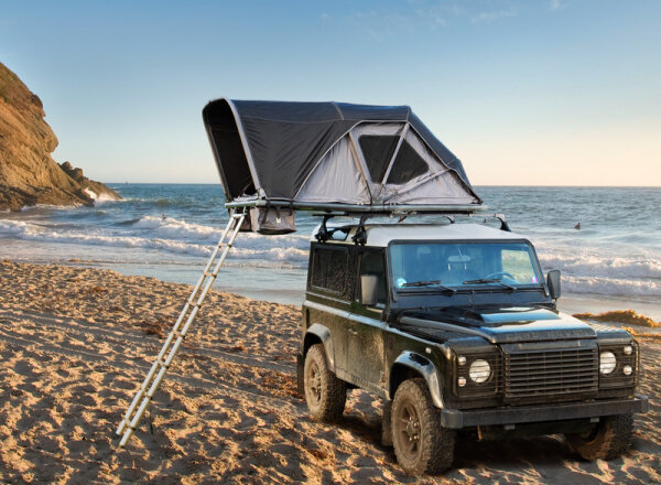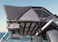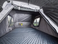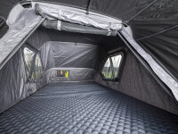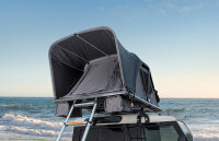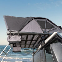 Roof tent in a new design for manual unfolding - suitable for cars, vans and SUVs. The roof tent is quickly unfolded. It is equipped with mosquito nets in all openings (3 sides), 2 practical shoe pockets at the outside entrance, a 7 cm thick comfortable mattress and an aluminum telescopic ladder. The base consists of a sturdy aluminum frame.Material: Tent: 220 g/m² polyester (PU coated), roof 200D polyester (weatherproof), tarpaulin: PVC (waterproof)Dimensions:Open L 212 x W 132 x H 102 cm,Closed L 107 x W 132 x H 25 cmSleeping area200 x 115 cmWeight: approx. 50 kg (including ladder)Load capacity: roof tent: 250 kg / ladder: 150 kgColor(tent and tarpaulin): GrayNote: Attachment on vehicles equipped with base carriers. Please take the maximum roof load of the vehicle into account.