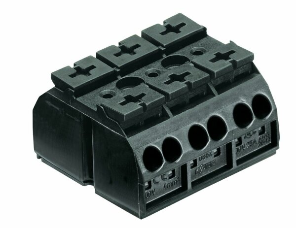 Max. 32A, Beschriftungsstreifen dazu: 709196 4er-Leiterklemme, 3-polig mit CAGE CLAMP® Anschluss, Befestigung mittels Schraube M3 oder Blechschraube ø 2.9mm; pro Pol: Ein Eingang und drei Ausgänge schwarz / 0.5-4mm2 / max. 32A