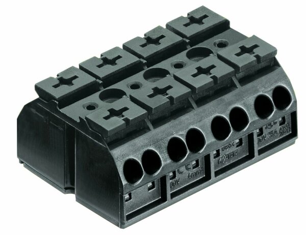 Max. 32A, Beschriftungsstreifen dazu: 709196 4er-Leiterklemme, 4-polig mit CAGE CLAMP® Anschluss, Befestigung mittels Schraube M3 oder Blechschraube ø 2.9mm; pro Pol: Ein Eingang und drei Ausgänge schwarz / 0.5-4mm2 / max. 32A