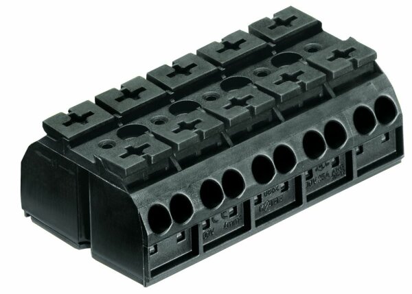 Max. 32A, Beschriftungsstreifen dazu: 709196 5-polig mit CAGE CLAMP® Anschluss, Befestigung mittels Schraube M3 oder Blechschraube ø 2.9mm; pro Pol: Ein Eingang und drei Ausgänge schwarz / 0.5-4mm2 / max. 32A