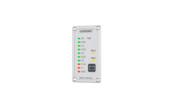 Dieses kompakte und robuste Gerät bringt wahlweise die zwei Spannungen der Bord- und der Starter-Batterie zur Anzeige. Es stellt den interessantesten Bereich der Batteriespannung von der Tiefentladung bis zur maximalen Ladespannung anschaulich dar. Die Leuchtpunktanzeige erbringt dabei eine recht genaue Anzeige der Batteriespannungen, da auch Zwischenwerte auf Grund unterschiedlich hell leuchtender benachbarter Leuchtpunkte gut abzulesen sind.