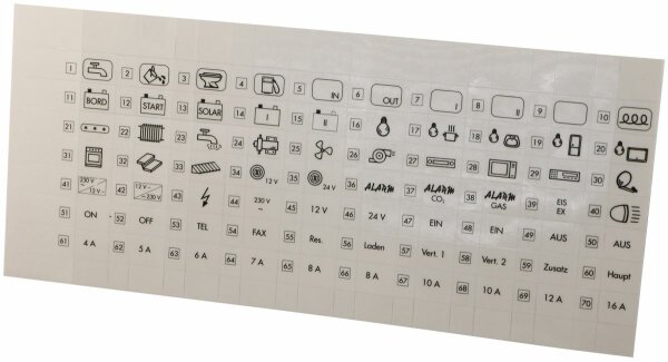 Zur sauberen Kennzeichnung von Schaltern und Sicherungen steht ein international verständlicher Beschriftungsbogen zur Verfügung. Diese Piktogramm-Folie mit 70 verschiedenen Piktogrammen ist transparent, selbstklebend und passend zum VOTRONIC Frontplattendesign abriebfest bedruckt. 70 verschiedene Piktogramme