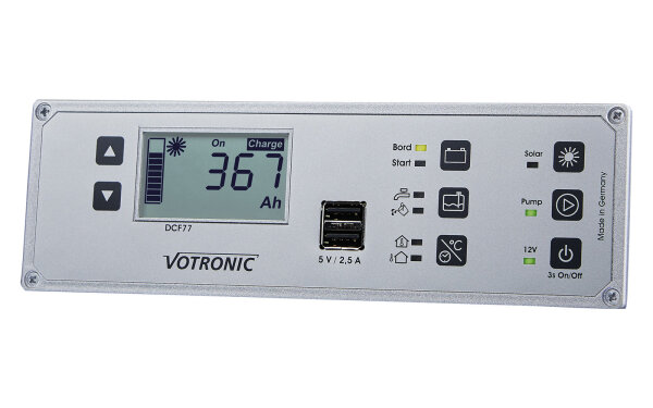 Das VOTRONIC Power Control (kurz VPC) ist ein innovatives Multi-Panel-System für Reisemobile, das die wichtigsten Funktionen und Informationen bedienerfreundlich in einem Gerät zusammen führt. Die Informationen werden über ein helles, weiß beleuchtetes Grafikdisplay dargestellt. Die groß angezeigten Werte sind bei allen Lichtverhältnissen auch aus größerer Entfernung hervorragend ablesbar.