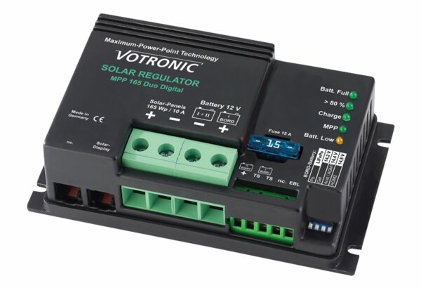 Régulateur solaire MPP pour les camping-cars, les caravanes et les bateaux de haute-qualité. Les régulateurs solaires Votronic de la série MPP (Maximum Power Point) et la caractéristique de charge IU1oU2 servent de lien entre le(s) panneau(x) solaire(s) et la (les) batterie(s). Avec la technologie MPP, le régulateur détermine automatiquement le rendement de puissance maximal des modules solaires plusieurs fois par seconde. Il transforme ensuite l'excès de tension du module solaire en courant de charge plus élevé pour la batterie (réalisé grâce à la technologie de régulateur de commutation haute fréquence avec un haut rendement). Ce gain de courant de charge permet de réduire les temps de charge et d'optimiser l'utilisation de la puissance du système solaire. Les régulateurs solaires MPP fonctionnent entièrement automatiquement, ne requièrent aucun entretien et offrent une multitude de fonctions. - Augmentation du courant de charge MPP de 10% à 3% (rendement > 95%). L’excès en performance est évidenet en particulier lors de la saison froide et par exemple en cas de couches de brouillard épaisses, d’éclairage plus faible et plus diffus (hiver). - Pour le chargement de batteries au plomb-gel, plomb-AGM, plom-acide ou de batteries complètes LiFePO4 (avec BMS intégré, balancing, circuit de sécurité et homologation!) des tensions nominales mentionnées et l’entretien des articles intégrés à ces batteries dans des systèmes installés de manière fixe avec les capacités de batterie et les programmes de charge mentionnés. - La tension de charge est réglée de manière à ce que la surcharge des batteries soit impossible. - Deux sorties de charge de batterie: charge automatique de la batterie d’approvisionnement principal du véhicule (BORD I) et charge de soutien et maintien de la charge (max. 1 A) de la batterie de démarrage du véhicule (Start II) avec protection contre la surcharge. - Charge ne nécessitant aucun contrôle: protection intégrée contre la surcharge, la surchauffe, l’inversion de tension et la décharge-retour de la batterie (en cas de puissance solaire trop faible, à la tombée de la nuit ou pendant la nuit, ect.). - Fonctionnement parallèle/tampon: Respect des prescriptions de charge même lors du fonctionnement simultané de plusieurs accessoires. - Protection contre la surcharge: règle le courant de charge de la batterie en cas de puissance solaire trop forte et si la batterie est complètement chargée, en cas de consommation de courant, elle veille à une recharge immédiate afin de conserver un état de charge de la batterie optimal. - Caractéristique de charge «IU1oU2»: une augmentation de la tension de charge définie (U1) empêche la formation de couches d’acide (plomb) et veille à une charge équilibrée des différentes cellules de la batterie (plomb et lithium), ensuite charge de maintien automatique (U2). Compensation du câble de charge: les pertes de tension sur les câbles de charge sont automatiquement compensées. - Filtre de réseau du véhicule: Fonctionnement parallèle avec des aérogénérateurs et des groupes générateurs, des chargeurs de réseaux, des générateurs etc. - Sortie de mesure pour EBL, éventuellement bloc électrique présent dans le domaine d’habitation du véhicule: permet d’utiliser facilement un affichage du courant solaire intégré dans le bloc électrique pour contrôler l’installation photovoltaïque. Veuillez contrôler au préalable la compatibilité de votre bloc électrique Schaudt (EBL) ainsi que le tableau de contrôle et d’affichage correspondant, car nousdéclinons toute responsabilité. - Sortie de commutation «AES» (seulement MPP 250, MPP 350 et MPP 430): entraîne, en cas d’excédent de puissance continue, la commutation automatique des réfrigérateurs avec «AES» (Automatic Energy Selector, Electrolux / Dometic) fonctionnant au gas vers un fonctionnement à 12  V. - Connexion pour le capteur de température de batterie (Art. 2001): pour les batteries au plomb, la tension de charge est automatiquement adaptée àla température de la batterie, entraîne, en cas de froid, une meilleure charge complète de la batterie plus faiblem en cas de températures estivales, il est possible d’éviter des dégagements de gaz et une sollicitation trop importante. Batteries LiFePO4: protection de la batterie en cas de températures élevées et en particulier, en cas de basses températures. Absolument conseillé si la température de la batterie peut passer au-dessous de 0° C pendant le fonctionnement. - Prêt à brancher pour les appareils d’affichage solaires Votronic, l’ordinateur solaire LCD S pour le contrôle optimal de l’installation. 131 x 40 x 77 mm *prix en soldes*