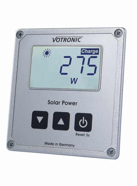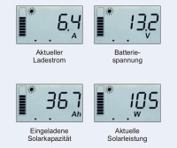 Mikroprozessorgesteuert werden folgende Werte gemessen, berechnet und angezeigt: - Aktuelle Solarleistung 0 - 999 W (Watt) - Aktueller Solarstrom 0 - 60.0 A (Ampere) - Die geografischen und wetterabhängigen Einflüsse zeigen sich sofort und unverkennbar. Dies gilt auch für die Sonnenausrichtung, Teilbeschattung oder Verschmutzung der Solar-Module. - Aktuelle Solarbatteriespannung 7 - 32.0 V (Volt) Erlaubt Rückschlüsse auf den Batteriezustand (blinkende Warnanzeige bie Unter- oder Überspannung der Batterie) - Eingeladene Solarkapazität 0 - 9’999 Ah (Amperestunden) - Eingeladene Solarenergie 0 - 9’999 kWh (Kilowattstunden) Die von den Solar-Modulen erzeugte Energie (Wh und kWh) und die in die Batterie eingeladene Kapazität (Ah) werden gemessen, aufaddiert und angezeigt, auch über Tage und Wochen hinweg. Die Anzeigewerte können jederzeit für eigene Statistikzwecke einzeln auf "Null" zurück gesetzt werden 80 x 85 x 25 mm