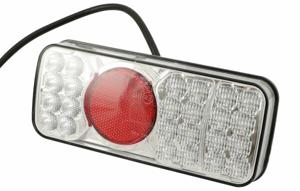 Links, farbloses Glas! mit Nebelschlussleuchte und Kennzeichenleuchte unten weiss: Masse schwarz: Schlusslicht/Kennzeichenlicht rot: Stop gelb: Blinker blau: Rückfahrlicht oder Nebelschlusslicht 200.5 x 85 x 40 mm, mit NSL und KZL unten, farbloses Glas