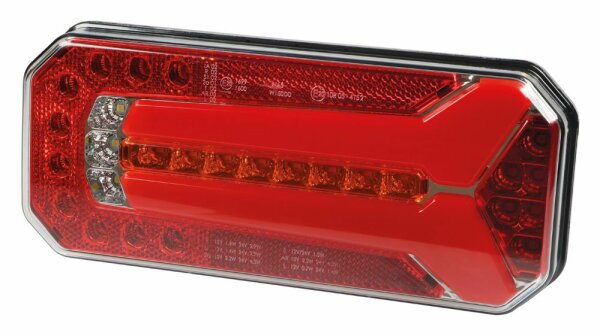 - rechts und links - dynamisches Blinklicht - IP68 - mit Nebelschluss- und Rückfahrleuchte - horizontale Montage - weitere Versionen auf Anfrage erhältlich - entspr. im 24V-Betrieb der ISO-Norm 13207-1 Steckerbelegung: 1 = Standlicht (sz) 2 = Positionslicht Ausgang (sz) 3 = Blinklicht (ge) 4 = Stoplicht (rt) 5 = Nebelschlusslicht (bl) 6 = Rückfahrlicht (gr) 7 = Masse (ws) 236x104mm, IP68, dynam. Blinklicht, NSL, RFL