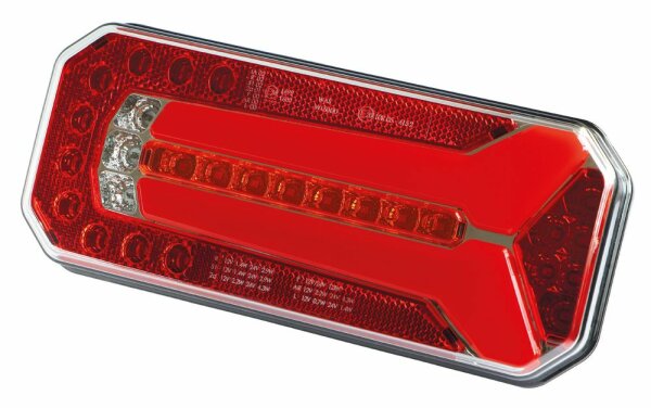 - rechts und links - dynamisches Blinklicht - IP68 - mit Nebelschlussleuchte - horizontale Montage - weitere Versionen auf Anfrage erhältlich - entspr. im 24V-Betrieb der ISO-Norm 13207-1 Steckerbelegung: 1 = Standlicht (sz) 2 = Positionslicht Ausgang (sz) 3 = Blinklicht (ge) 4 = Stoplicht (rt) 5 = Nebelschlusslicht (bl) 6 = Rückfahrlicht (gr) 7 = Masse (ws) 236x104mm, IP68, dynam. Blinklicht, NSL