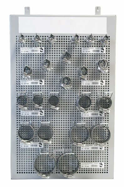 25x 8...12mm (7.5mm) 25x 10...16mm (7.5mm) 25x 12...20mm (9.0mm) 25x 16...25mm (9.0mm) 25x 20...32mm (9.0mm) 15x 25...40mm (9.0mm) 10x 32...50mm (9.0mm) 10x 40...60mm (9.0mm) 10x 50...70mm (9.0mm) Norma Schlauchschellen Wandhalter