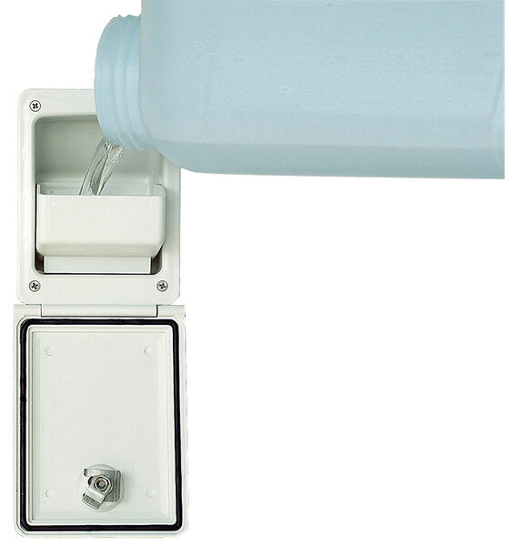 Kunststoff Wasserbelüffklappe mit integriertem Trichter in weißer Ausfürhung für Füllschlauch-Durchmesser 40 mm. Weitere Spezifikationen:Wandstärke: 16-40 mm