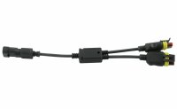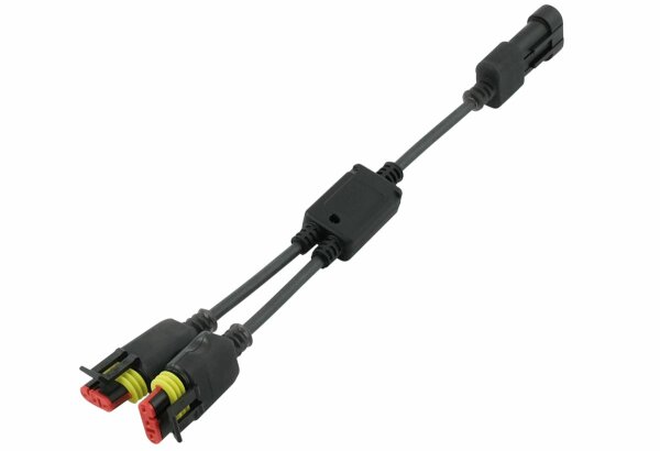 Anzahl von Anschlüssen: 3 x 2-Wege-Weibchen Nennstrom: 14 A max. pro Anschluss Nennspannung: 24V DC max. IP Schutz: IP67 Betriebstemperaturbereich: -40°C bis 125°C Anschluss: Messing verzinnt Steckergehäuse: Glasgefülltes Nylon 6.6 Chemische Beständigkeit: Benzin, Diesel, Öle, Frostschutzmittel Länge: 200 mm