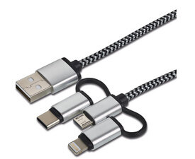 cartrend Daten- & Ladekabel 3in1, Lightning/Micro-USB/USB-C Multi-Ladekabel, für den Anschluss von Apple Lightning, USB-C und Micro-USB-Geräten an einen USB-A Anschluss, extrem strapazierfähig durch nylongebundene Ummantelung, Farbe: schwarz/silber, Länge: 1,0 m (10407)